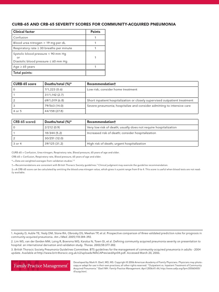 Patients who have a crb65 score of 1 or 2 are at increased risk of death, particularly with a score of 2, and hospital referral and assessment should be considered. An earlier, more detailed score known as the. Pneumonia severity index (psi/port score) 18. Patients are assigned to one of five risk classes based on a more complex point system than in. This score is useful when blood tests are not.